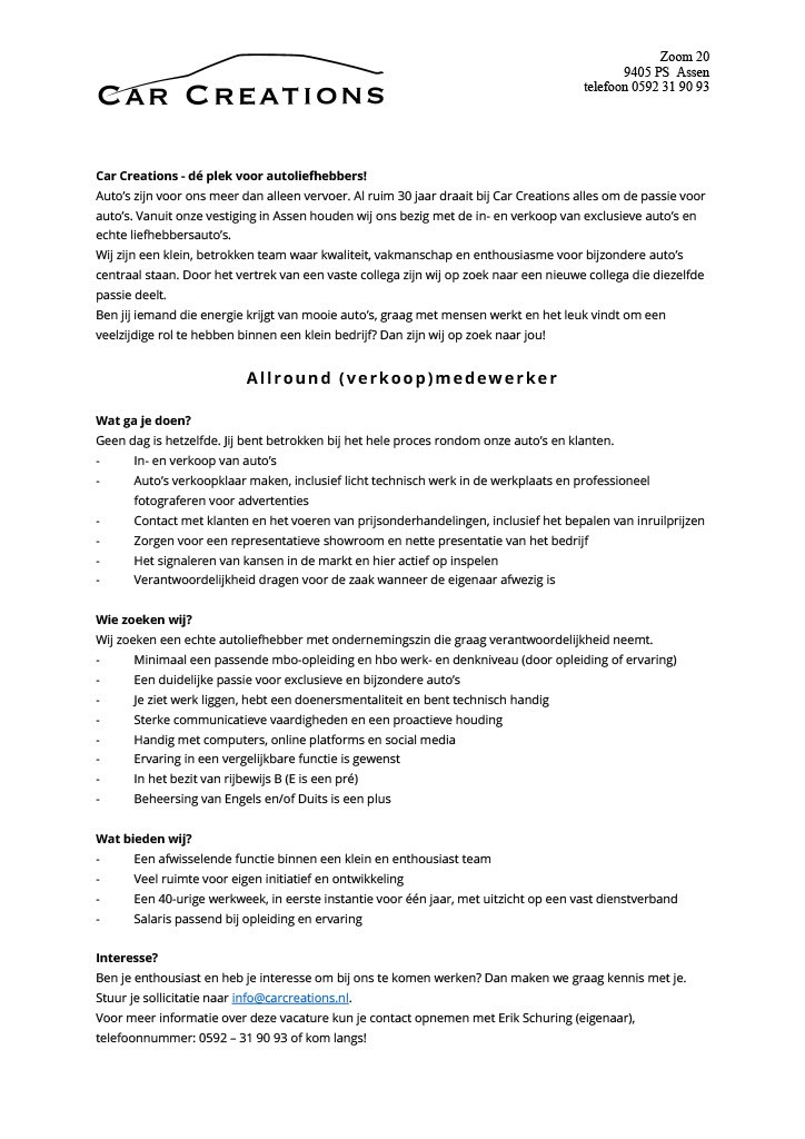 Car Creations is ruim 25 jaar gevestigd in Assen. Destijds specialist in car entertainment (audio, alarm, navigatie, carkits). Na de verhuizing naar de Zoom 20 in 2007 is daar de in- en verkoop van jonge occasions aan toegevoegd. Sindsdien is dit onze hoofdactiviteit. Hierbij focussen wij ons op de meer complete en bijzondere uitvoeringen van premium automerken.